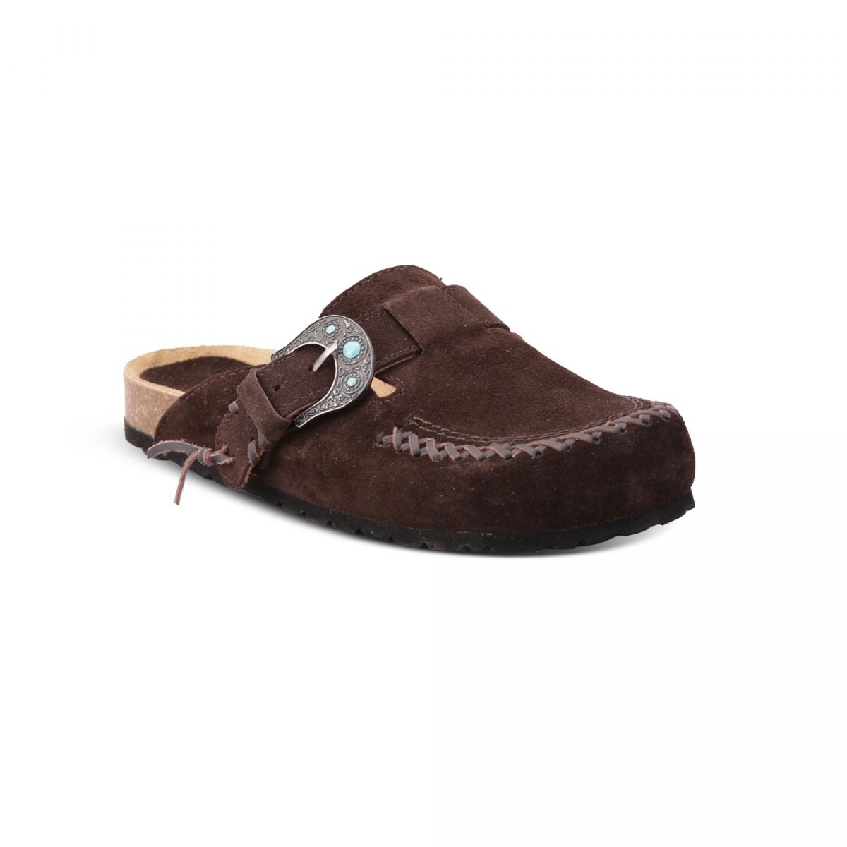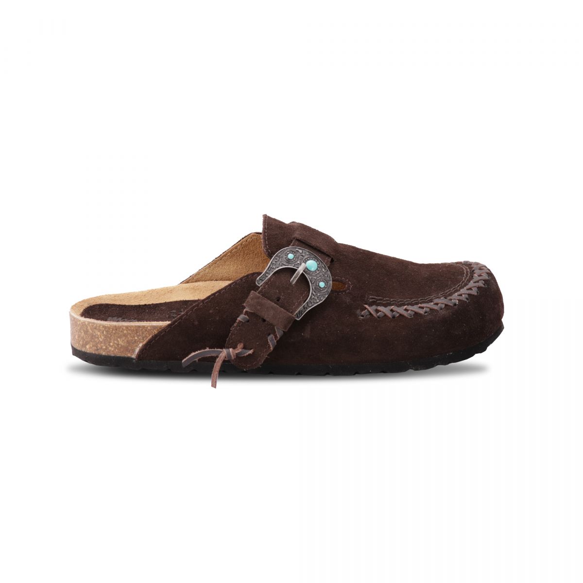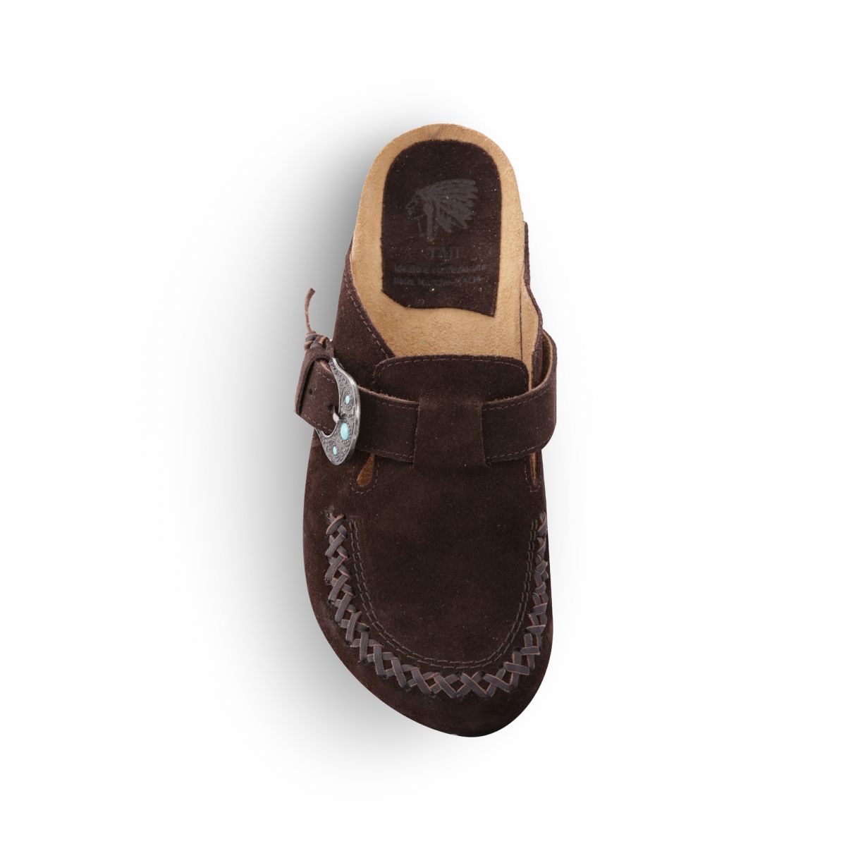Sabot 1 fibbia con pietre color turchese, suola anatomica foderata in crosta di vitello tomaia in suede color testa con infilatura in pelle di vitello