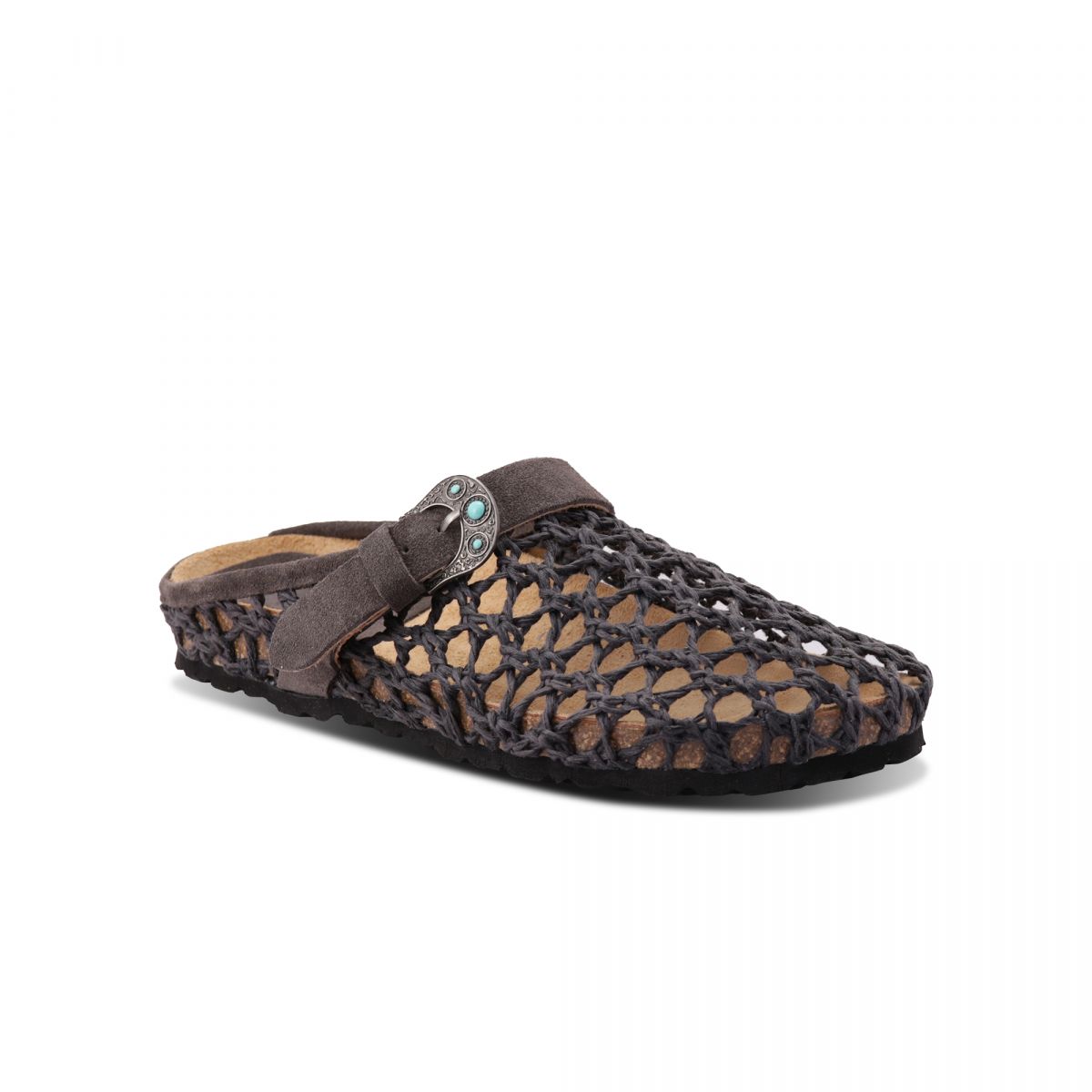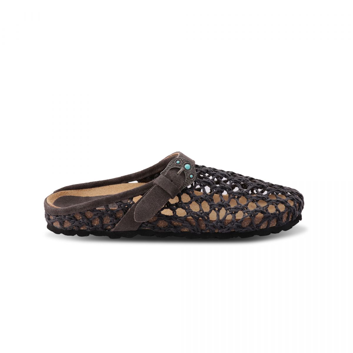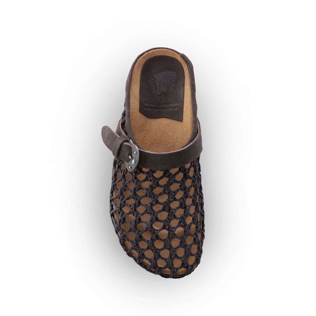 Sabot 1 fibbia con pietre color turchese, suola anatomica foderata in crosta di vitello tomaia in intreccio