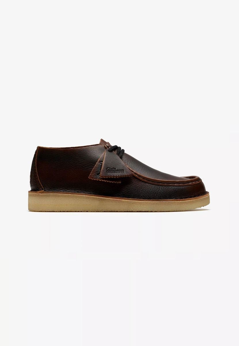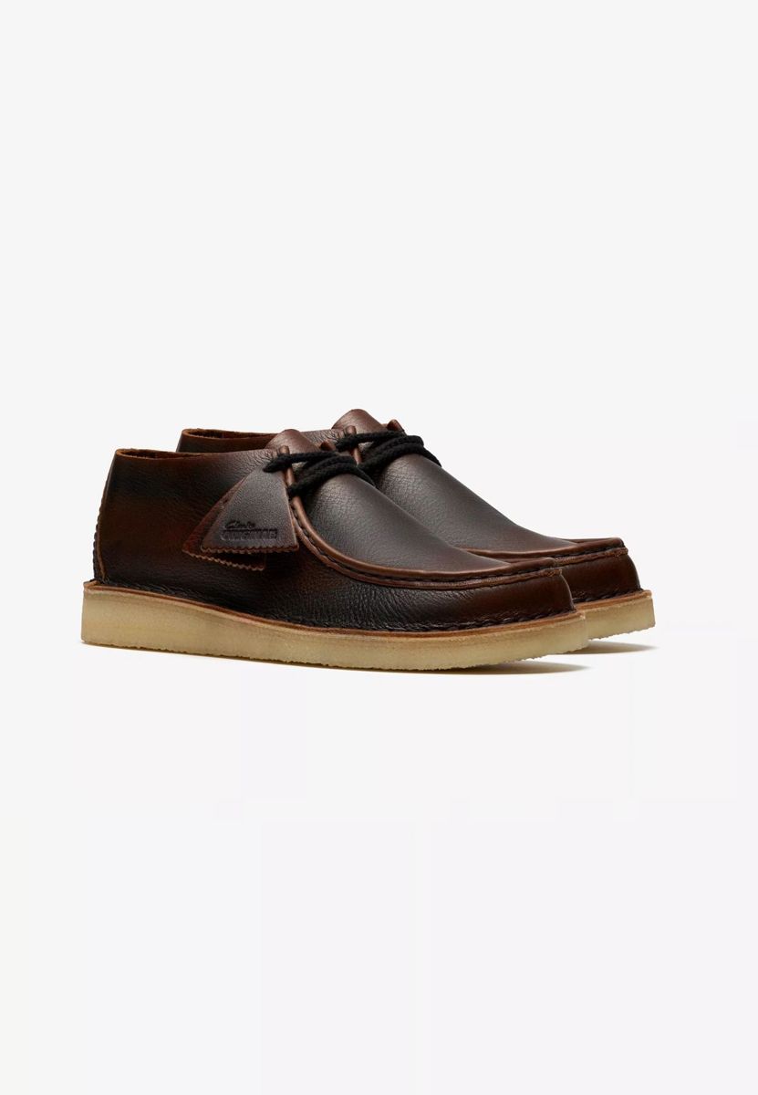 Il Dark Tan Combi presenta una tomaia in pelle marrone/nera sofisticata su una suola naturale in crepe a ciottoli.