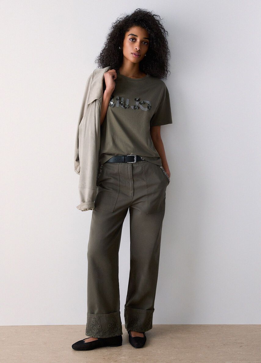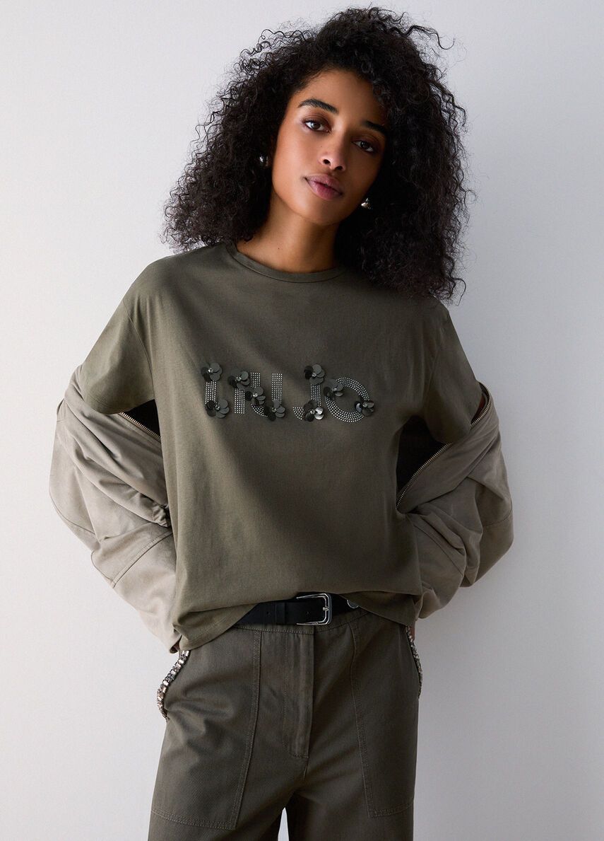 T-shirt in jersey di cotonegirocollomaniche cortestampa e applicazioni gioiello100%co