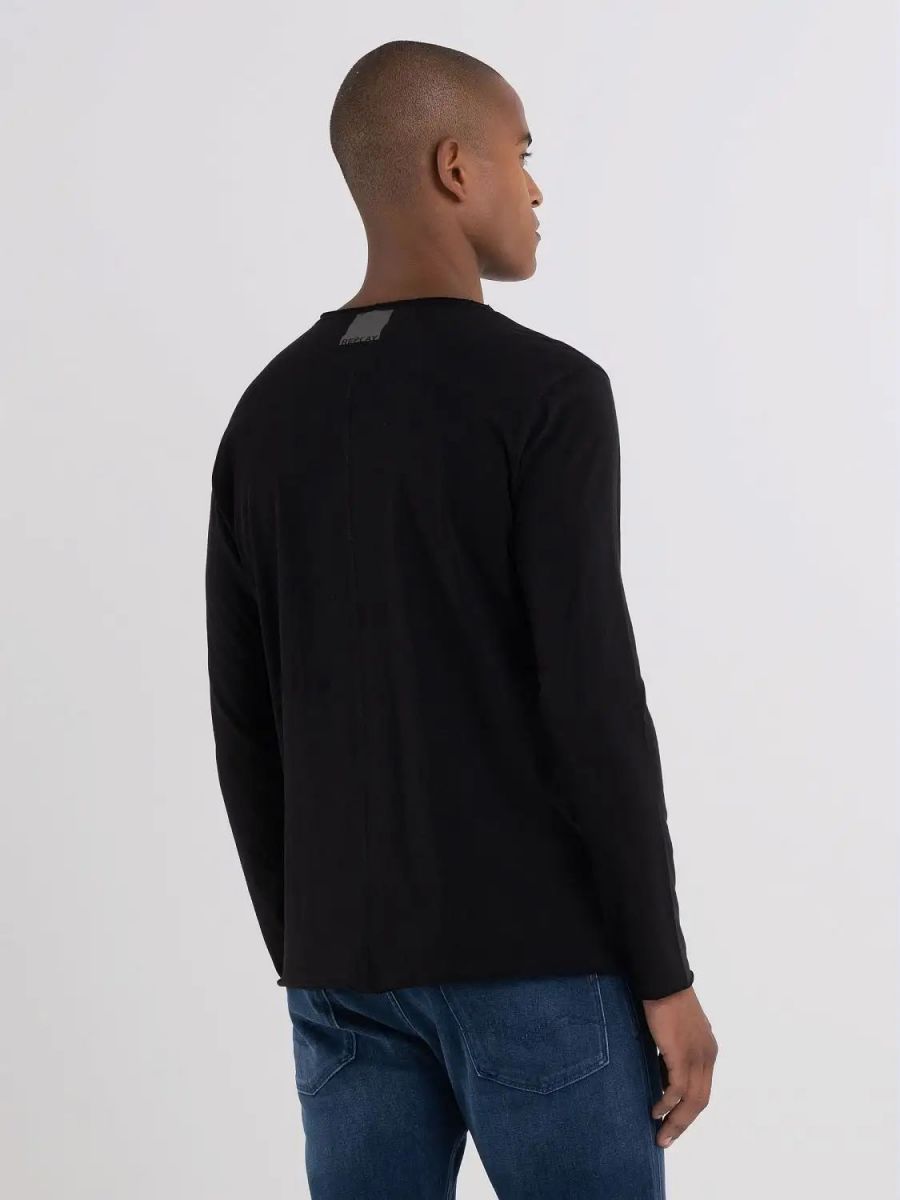 T-shirt girocollo realizzata in jersey di cotone con vestibilità regolare. Il modello a maniche lunghe si caratterizza per i profili con taglio a vivo che conferiscono un aspetto vissuto. Il capo dal look semplice e minimale è rifinito dalla stampa personalizzatasul lato della manica. 100%COTONE.