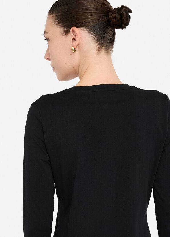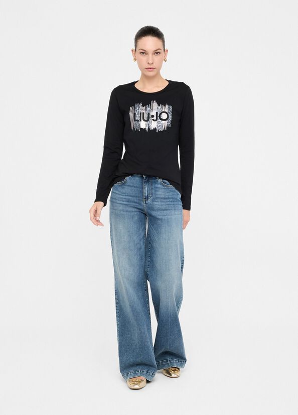 T-shirt con filati 100% cotone maniche lunghe girocollo stampa sul davanti strass applicati 100%co