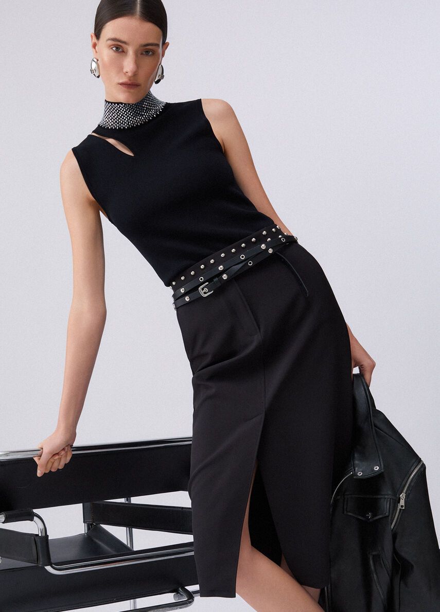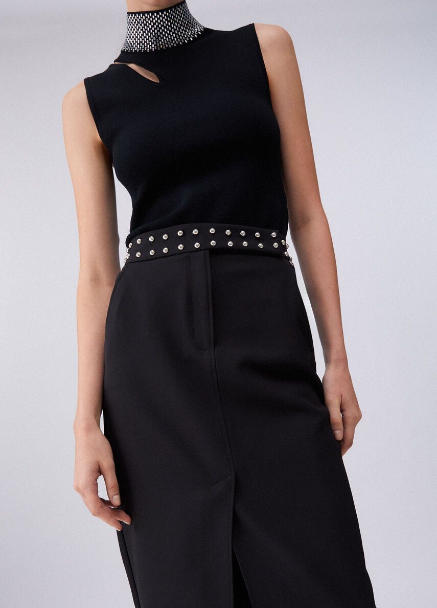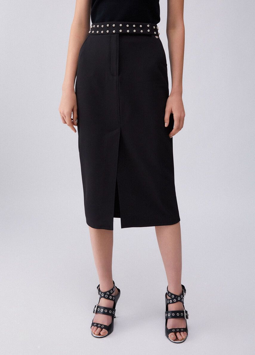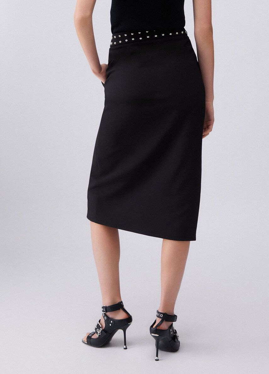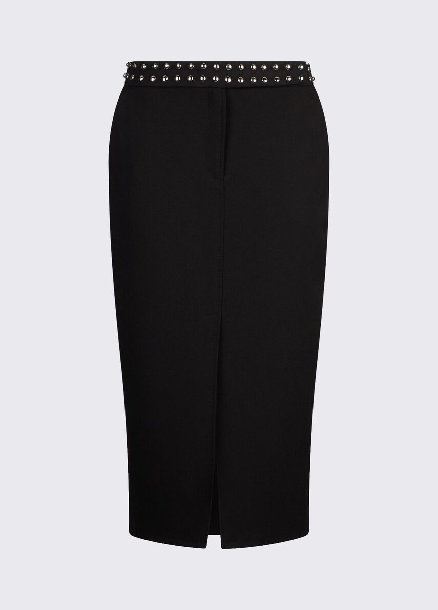 Gonna longuette nera in crêpe fluidoslim fitcintone sartoriale con borchie applicatecomode tasche 100%vi