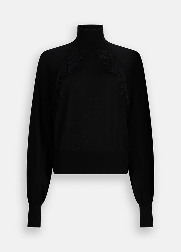 Dolcevita in lana neradettagli in pizzomaniche raglan a palloncinobordi a costine100%wv