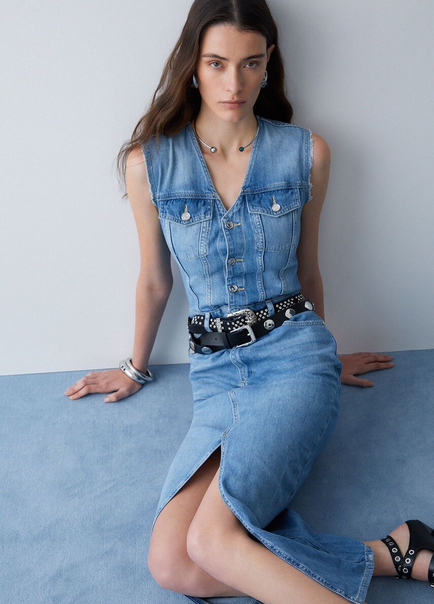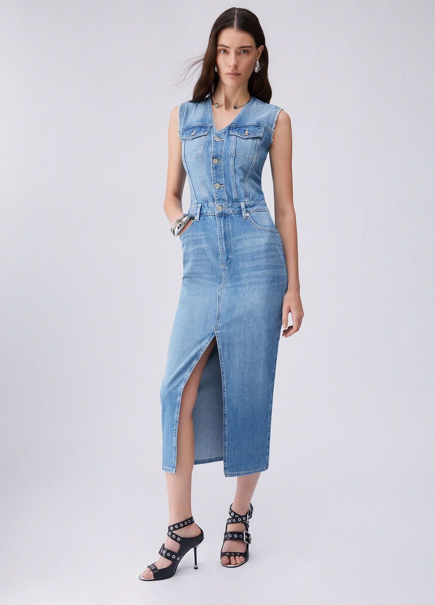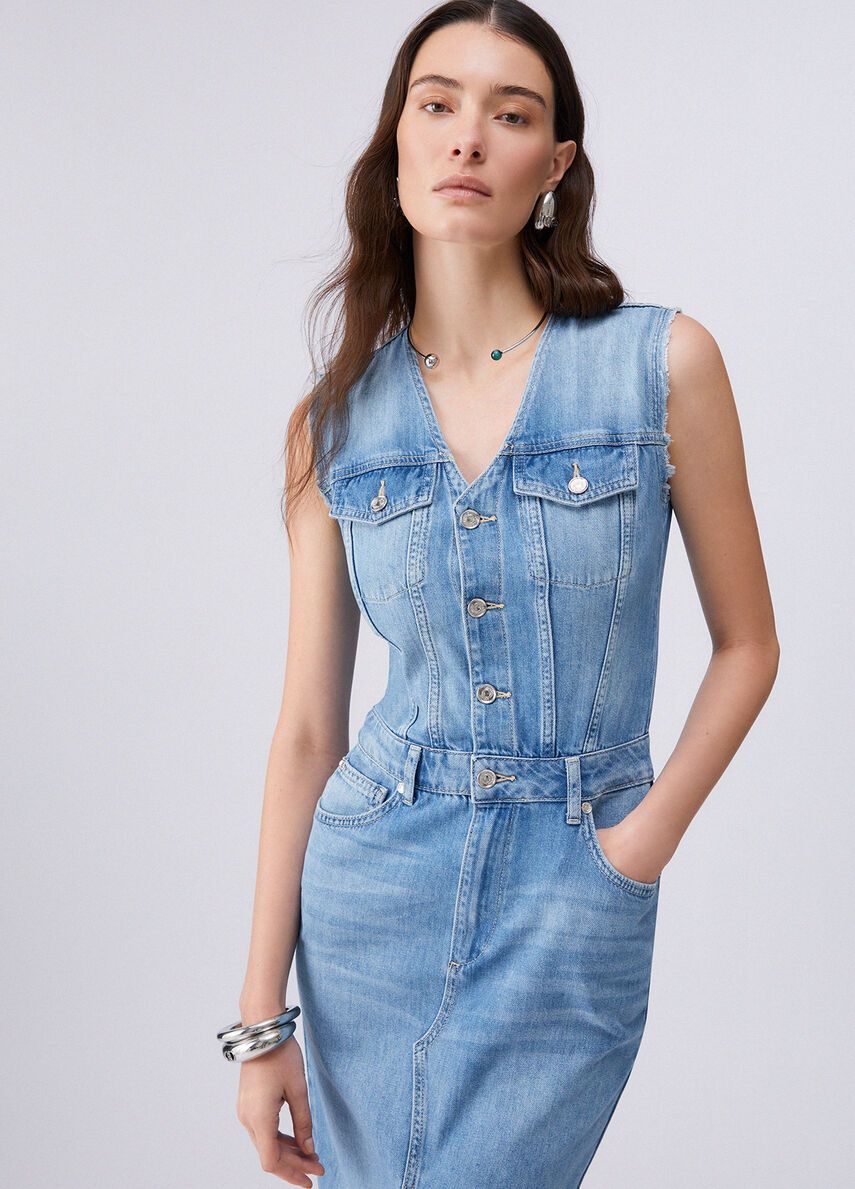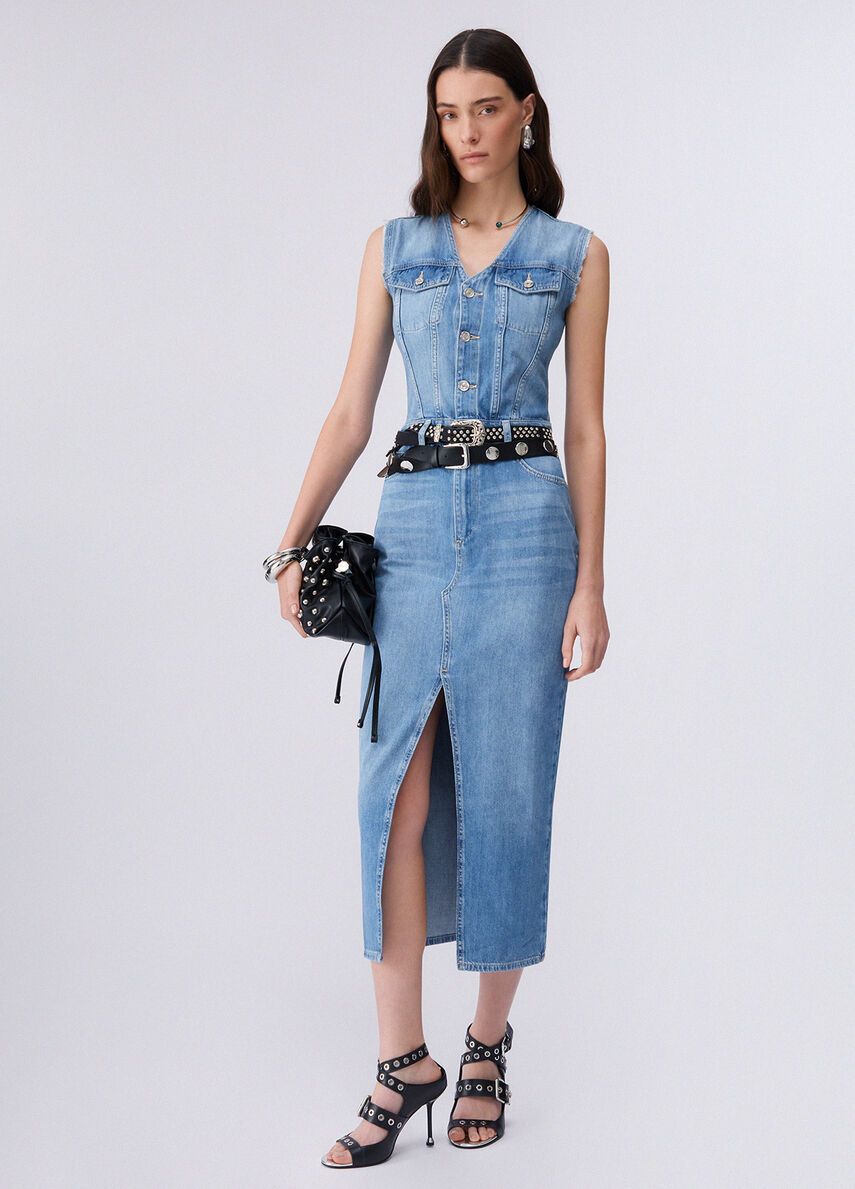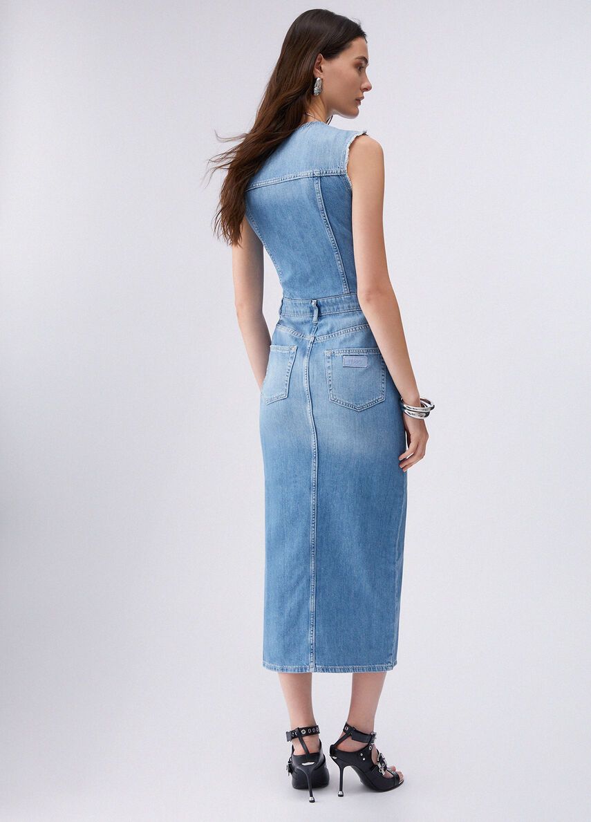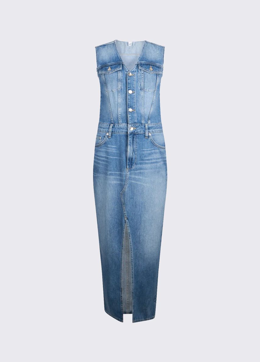 Vestito lungo in denim no-stretchlavaggio stonewash con baffi e graffiaturescollo a vmaniche con orli unfinished 100%co