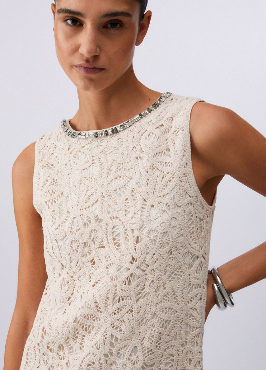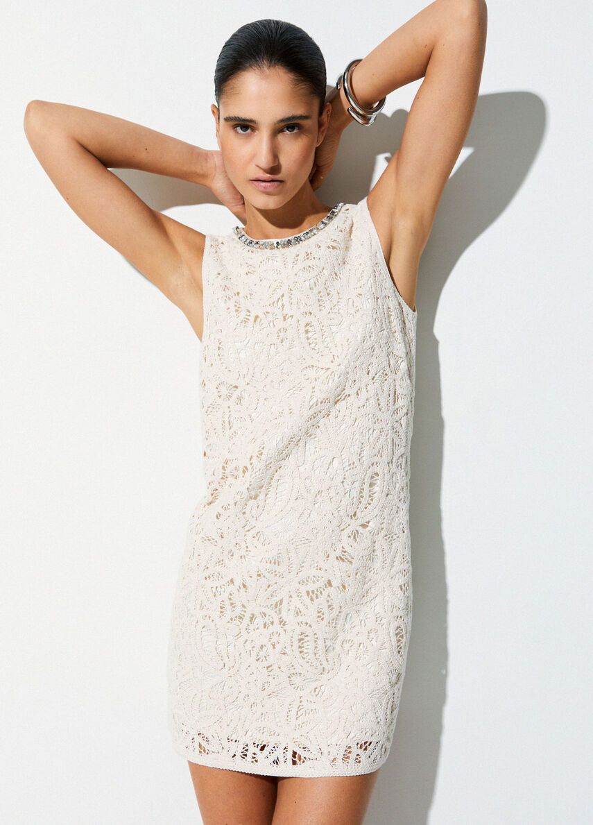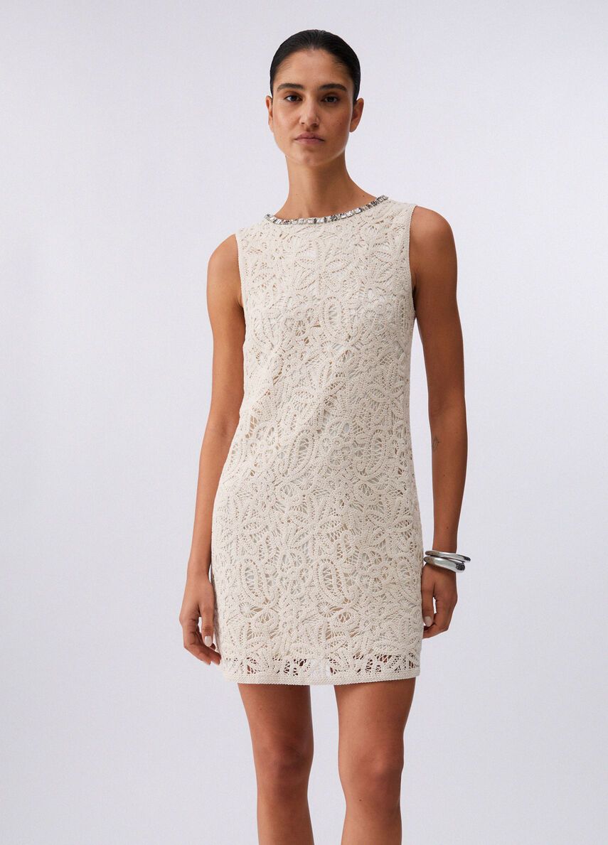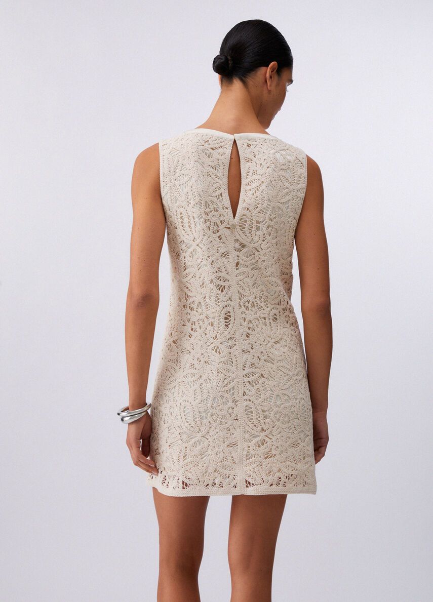 Abito corto in macramèfilati in puro cotonefoderachiusura a goccia posteriore100%co