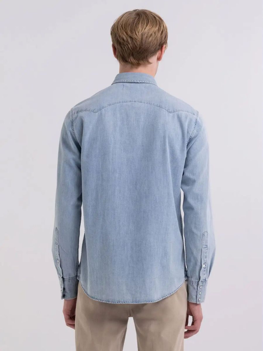 Camicia dalla vestibilità regolare realizzata in blu profondo denim di cotone 7 oz invecchiato 5 anni con tono di lavaggio chiaro stone wash. Il modello a maniche lunghe d'isipirazione western, si caratterizza per il trattamento con candeggio che ricrea contrastidi colore nelle zone d'usura. Il capo con tasche funzionali sul davanti e abrasioni localizzate lungo i bordi, è rifinito dal carréad ali di gabbiano fronte retro e dalla chiusura con bottoni automatici. MAGGIORI INFORMAZIONI COMPOSIZIONE: 100%COTONE; SOSTENIBILE: Sustainable cotton 100% BCI COTTONCamicia dalla vestibilità regolare realizzata in blu profondo denim di cotone 7 oz invecchiato 5 anni con tono di lavaggio chiaro stone wash. Il modello a maniche lunghe d'isipirazione western, si caratterizza per il trattamento con candeggio che ricrea contrastidi colore nelle zone d'usura. Il capo con tasche funzionali sul davanti e abrasioni localizzate lungo i bordi, è rifinito dal carréad ali di gabbiano fronte retro e dalla chiusura con bottoni automatici.
