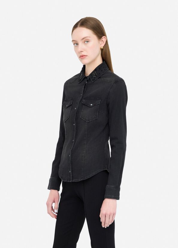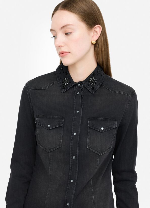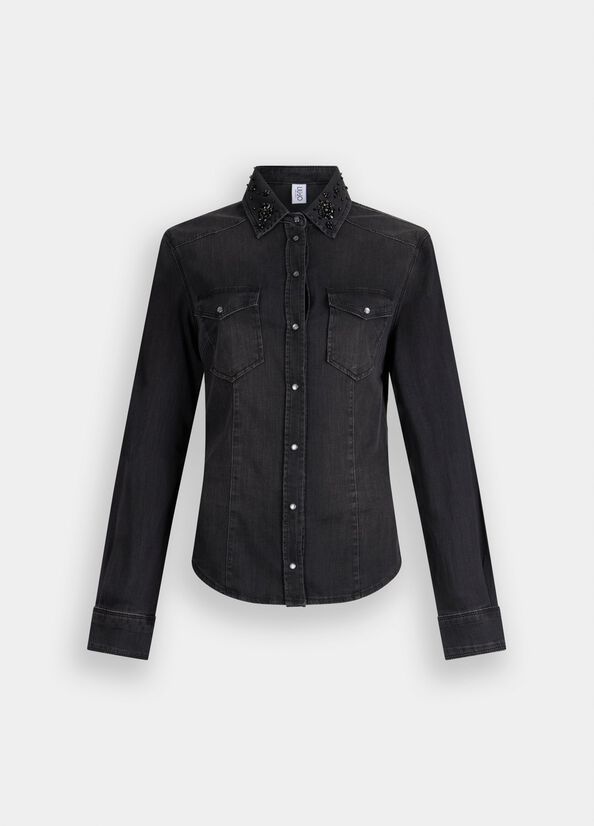 Camicia in denim di cotone stretchstrass applicatilavaggio usedcolletto classico 98%co 2%ea