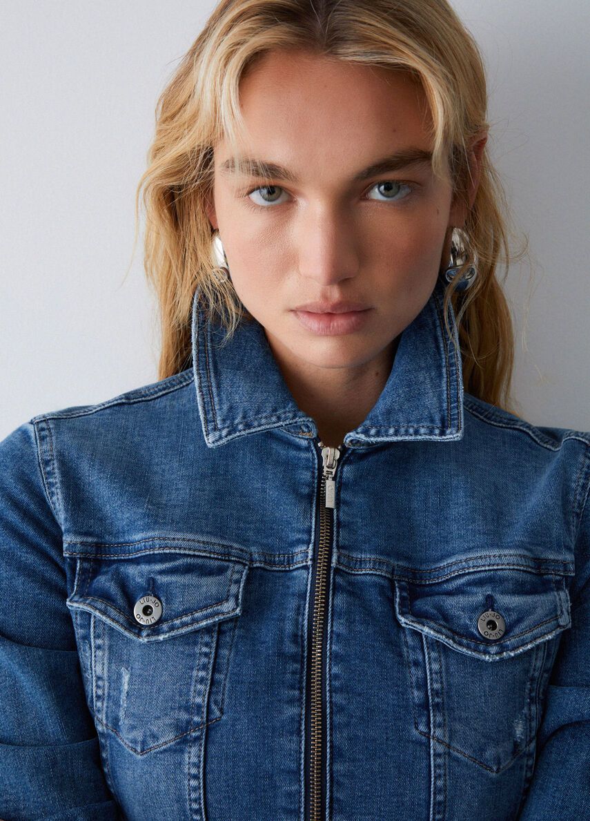 Giacca di jeans in denim stretchlavaggio stonewash con leggere graffiaturecomode taschechiusura con zip 98%co 2%ea