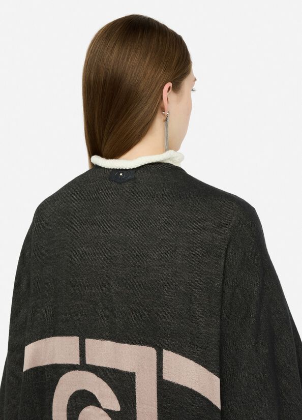 Poncho beigebordi con frangepatch logata sul retrologo monogram jacquard 100%pc
