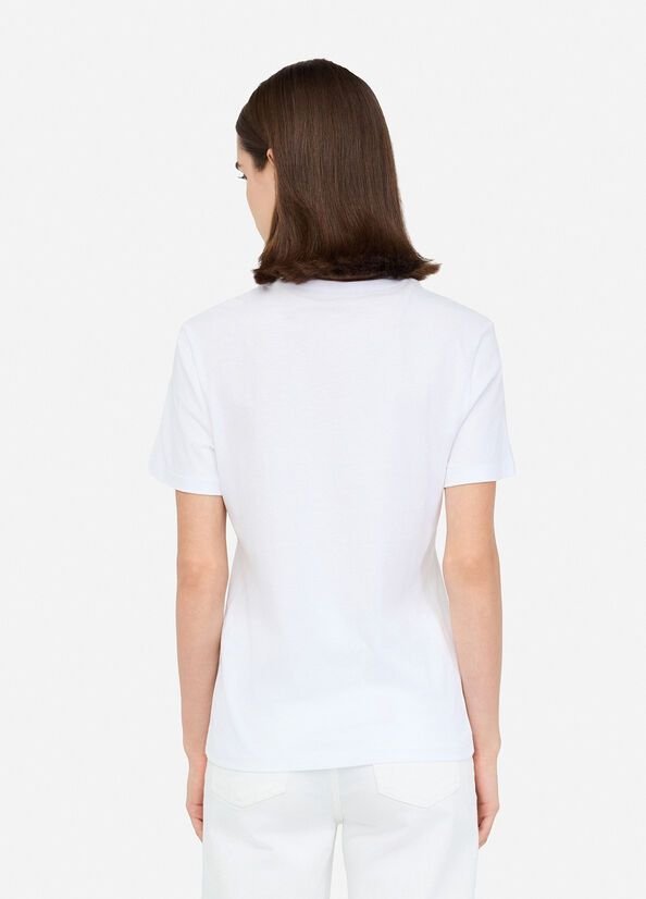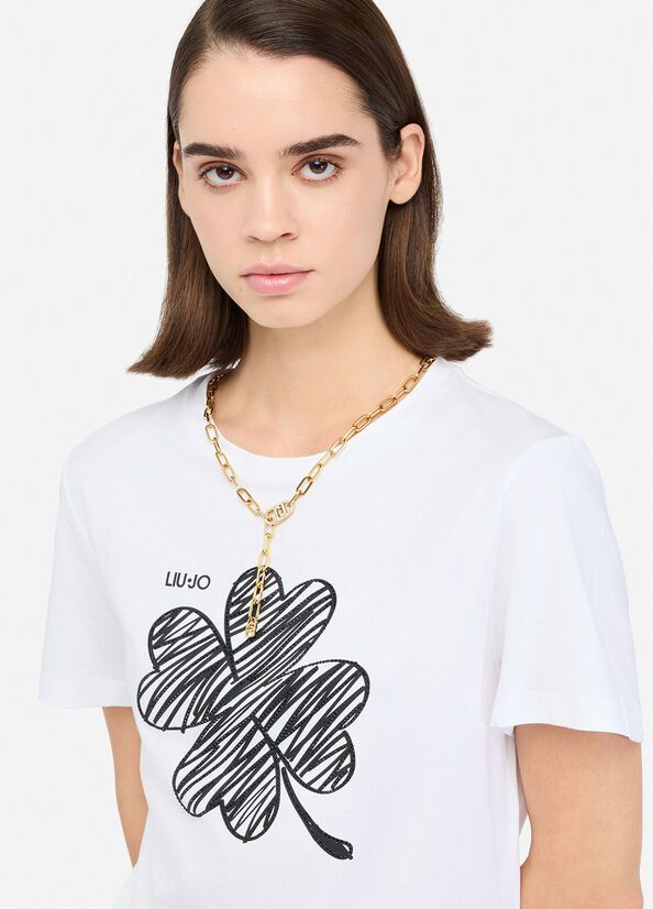 T-shirt in jersey di cotonegirocollomaniche cortestampa e strass applicati100%co