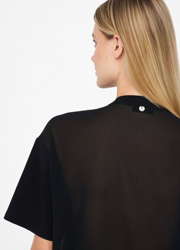 T-shirt nerarealizzata in jersey di cotone stretch e georgettecollo con perle e strassmaniche corte95%co 5%ea