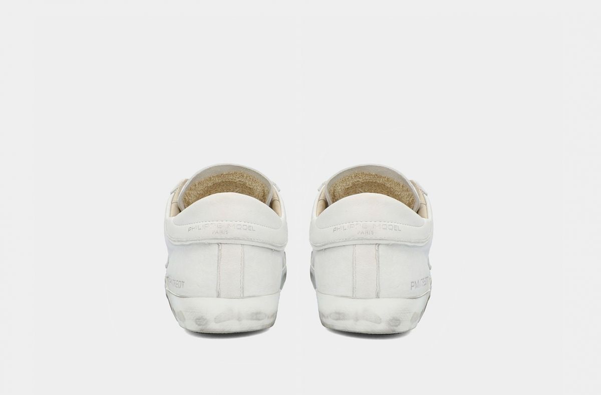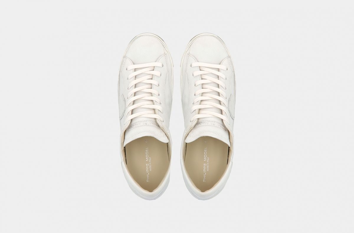 Il concetto di vissuto come sinonimo di artigianalità trova nella PRSX la sua espressione massima, grazie alla particolare fasciatura della suola, volutamente imperfetta e per questo brevettata dal marchio. Lo scudetto sul lato della scarpa rappresenta il blasone della Città di Parigi, dove Philippe Model lanciò il suo brand. La tomaia è realizzata in pelle bianca lavata, con sporcature ad effetto vintage. Il laccio è di colore burro con effetto consumato. La suola, alta 2,5 centimetri, è realizzata in gomma spazzolata con effetto vintage. Philippe Model Paris utilizza materiali e pellami di origine italiana. Il tutto all'insegna del "Fatto con cura in Italia".