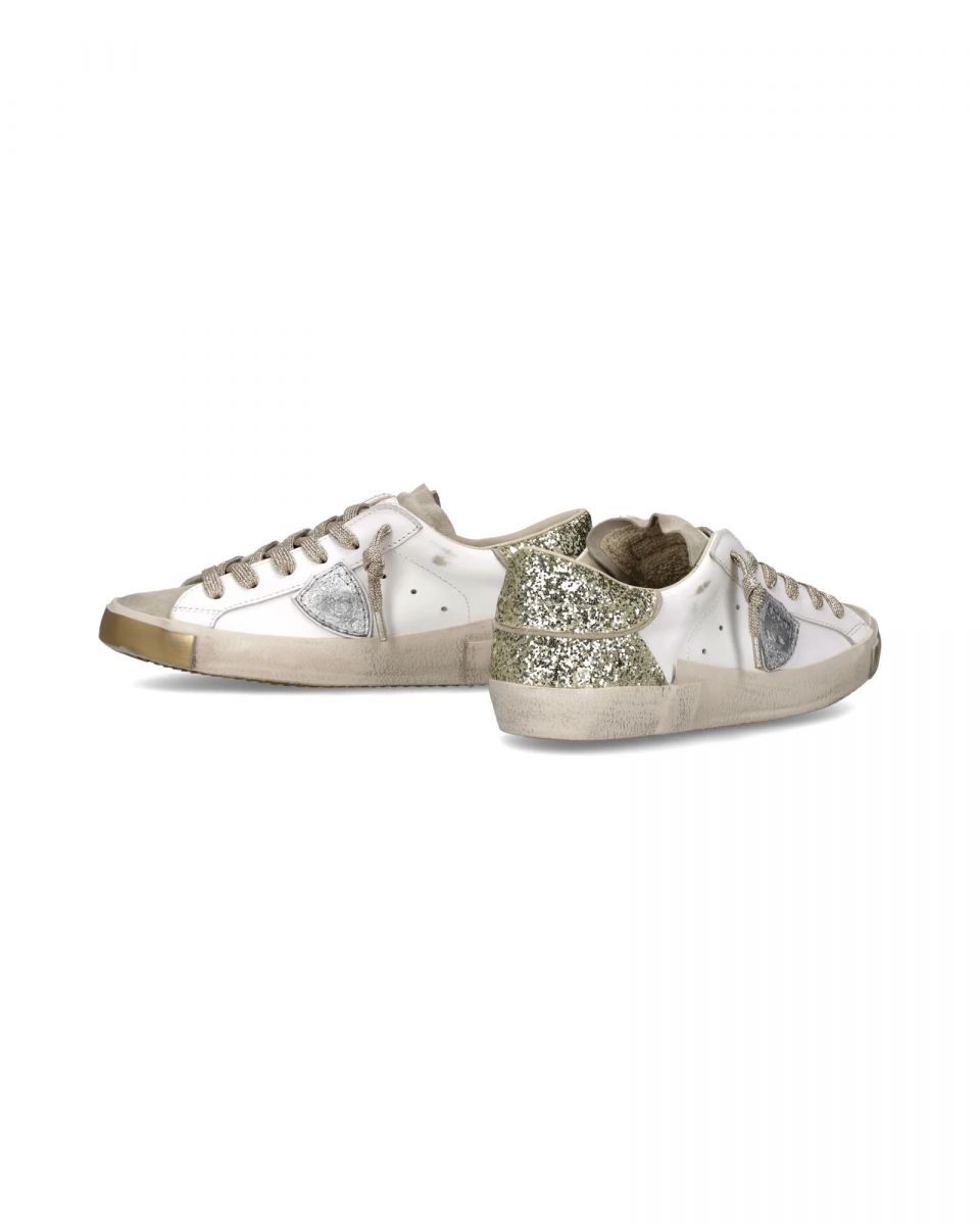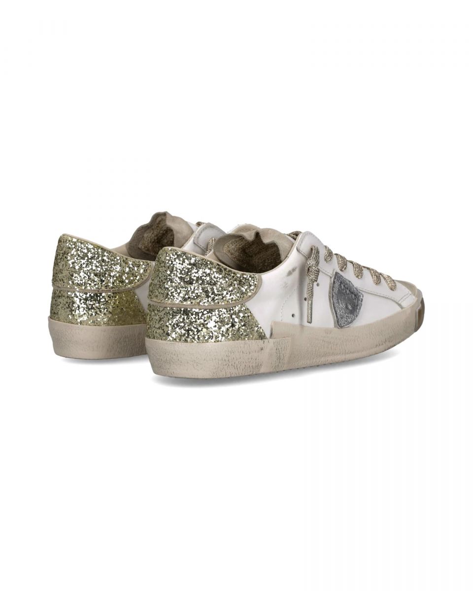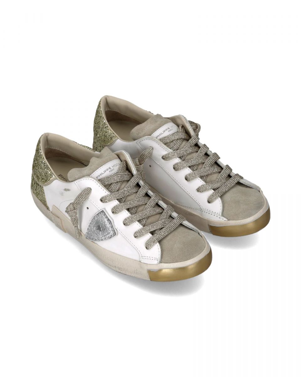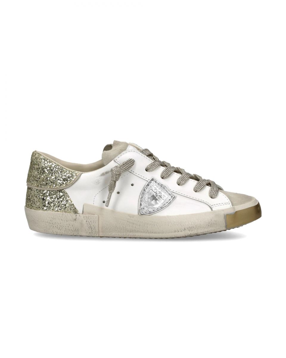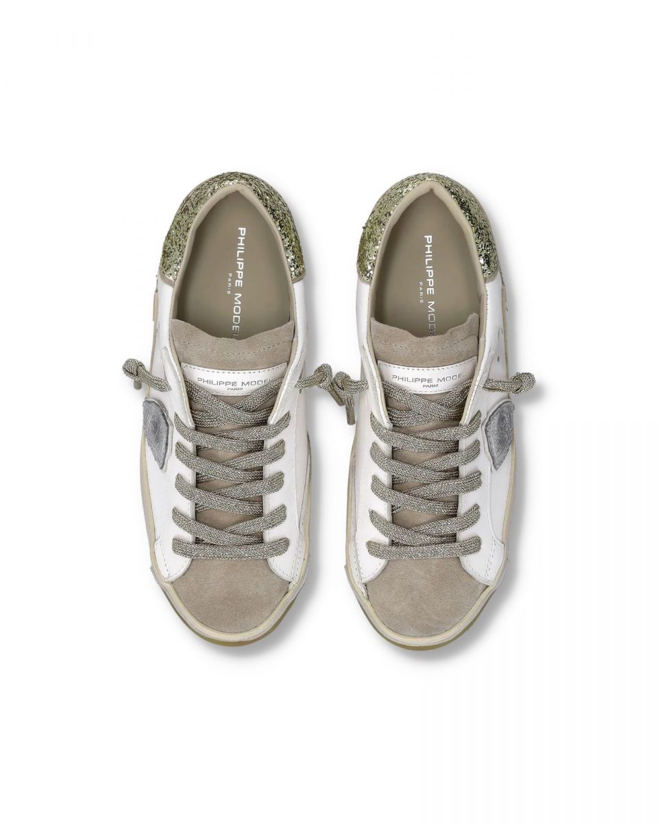 Prsx resta fedele alla sua anima iconica, ma in questa versione si accende di glitter e contrasti inediti. La tomaia di questa scarpa bassa da donna in pelle bianca, lavorata per un effetto vissuto, incontra dettagli luminosi e texture a contrasto. Lacci e tallone glitterati nei toni dell’oro, linguetta in suede beige e scudetto laterale argento definiscono un equilibrio unico tra luce e materia. La suola, con fresature artigianali e sporcature effetto used, è completata da un tocco prezioso: un inserto dorato applicato sulla punta. Materiali: Sneaker bassa con tomaia in pelle con finiture used, tallone glitterato come i lacci e linguetta in suede. Fodera interna in spugna di cotone e pelle, soletta in schiuma estraibile. Fondo in gomma con fasciatura irregolare rifinita artigianalmente, punta oro. Composizione: 85% CALF LEATHER - 15% TEXTILE Suola: 2.5 CM