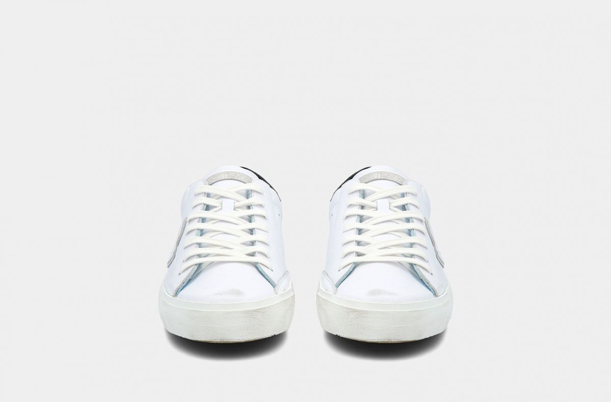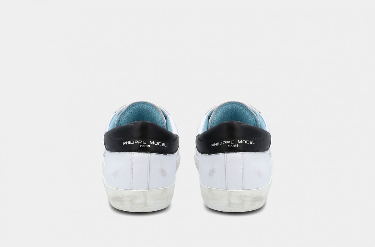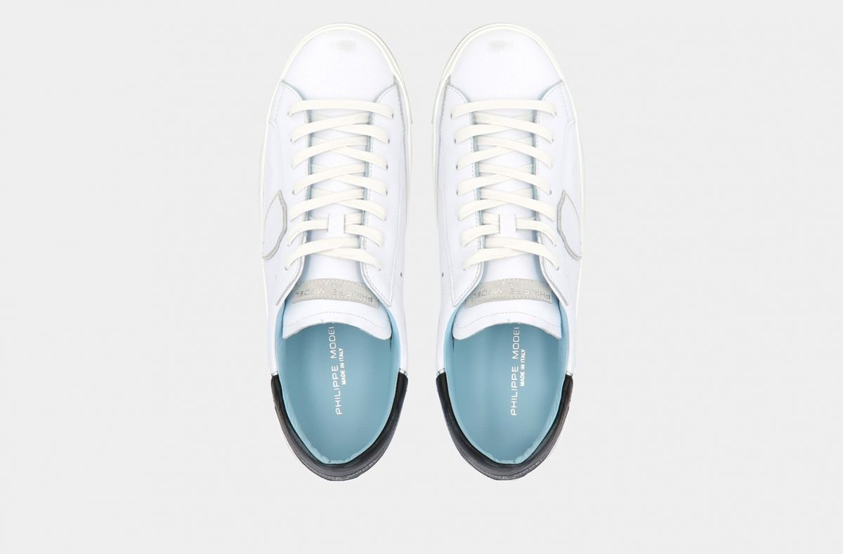 Il concetto di vissuto come sinonimo di artigianalità trova nella PRSX la sua espressione massima, grazie alla particolare fasciatura della suola, volutamente imperfetta e per questo brevettata dal marchio. Lo scudetto sul lato della scarpa rappresenta il blasone della Città di Parigi, dove Philippe Model lanciò il suo brand. La tomaia è realizzata in pelle di vitello e suede, con inserti di tessuto a specchio, fodera azzurra "Philippe Model" e sporcature ad effetto vintage. Il laccio è di colore bianco con effetto consumato. La suola, alta 2,5 centimetri, è realizzata in gomma spazzolata con effetto vintage. Philippe Model Paris utilizza materiali e pellami di origine italiana. Il tutto all'insegna del "Fatto con cura in Italia".